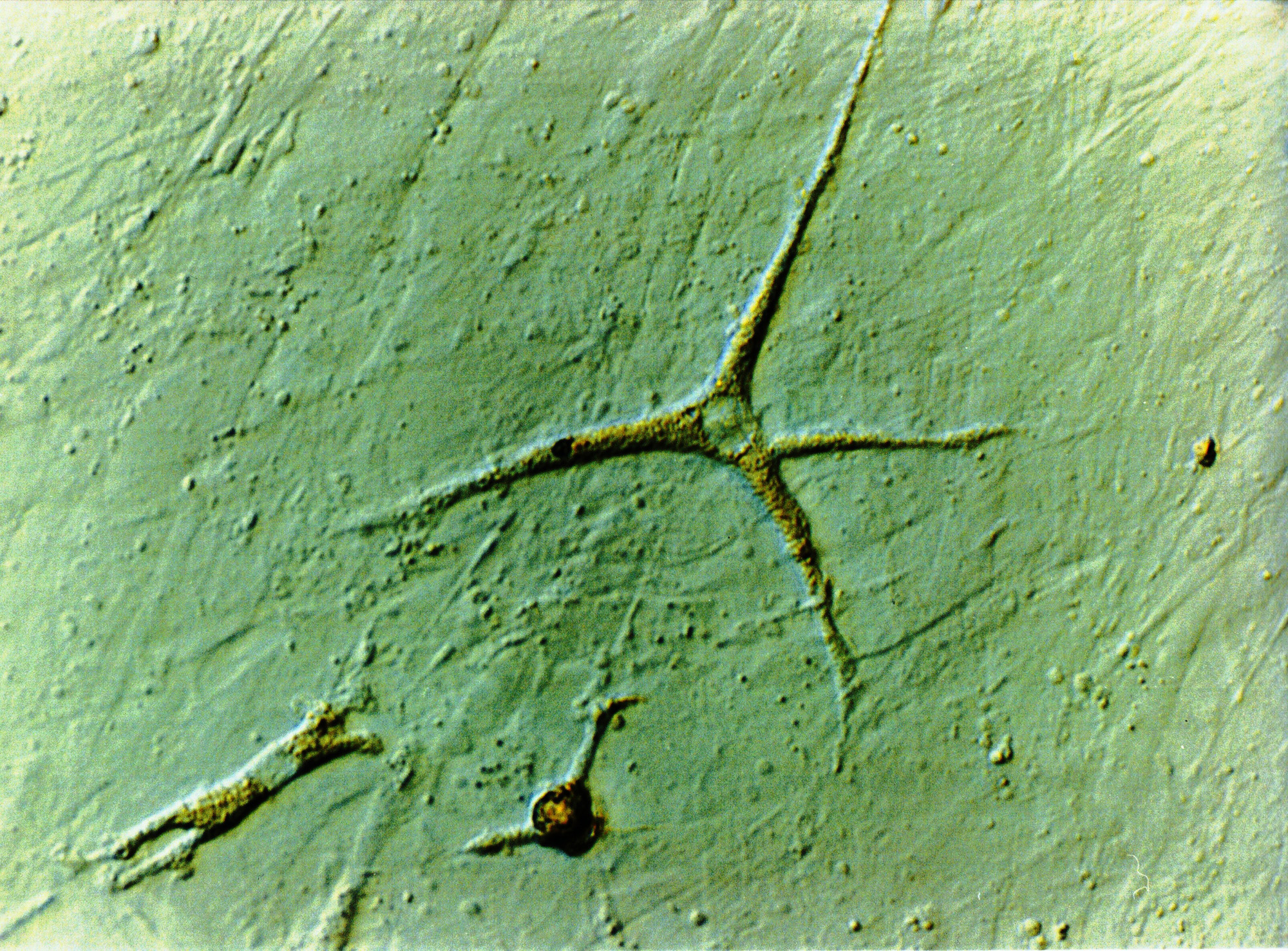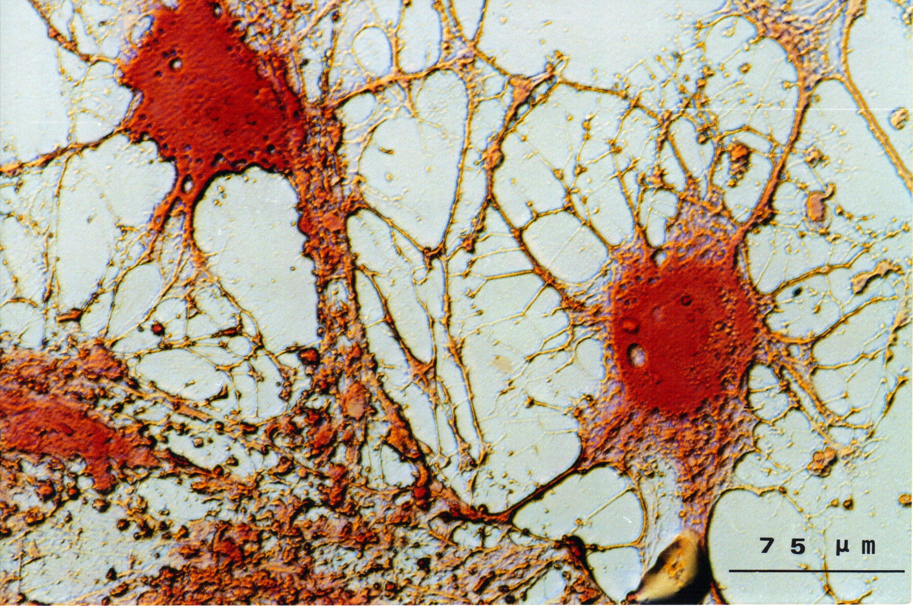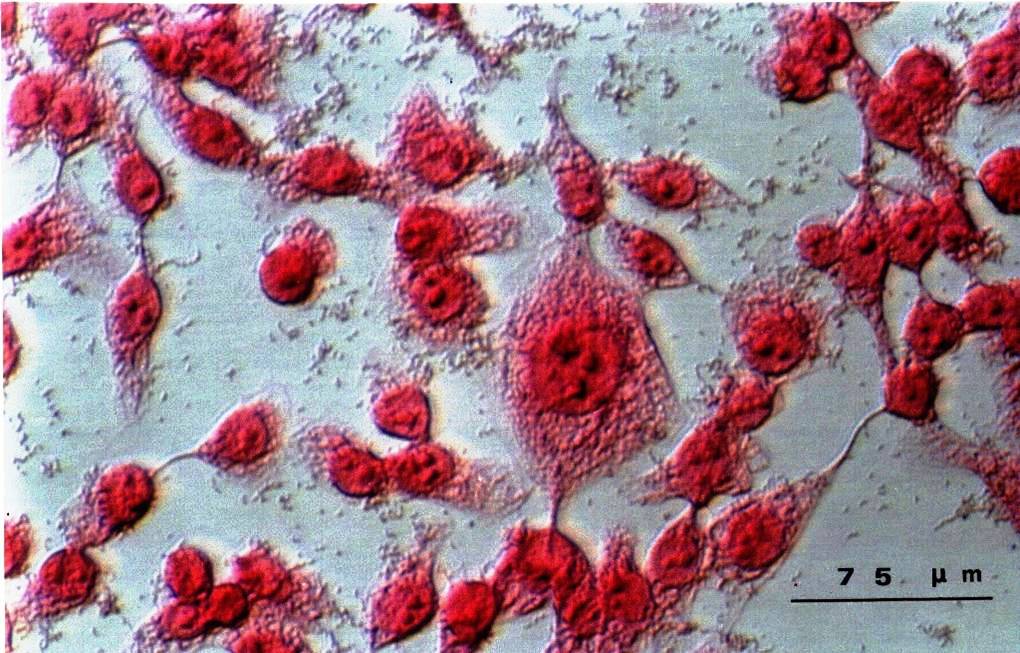 Εικ. 1α-2: Tρόπος διαπλοκής ινοκυττάρων σε καλλιέργειες φυσιολογικού μυελού οστών 92 ημερών. Διακρίνονται οι ευμεγέθεις πυρήνες δύο κυττάρων με τους περιεχόμενους πυρηνίσκους (σκούρες-κόκκινες κουκίδες) καθώς και οι άφθονες διαπλεκόμενες κυτταροπλασματικές αποφυάδες. - Χρώση: Σαφρανίνη - Μεγέθυνση: x400 εικόνα εικόνα