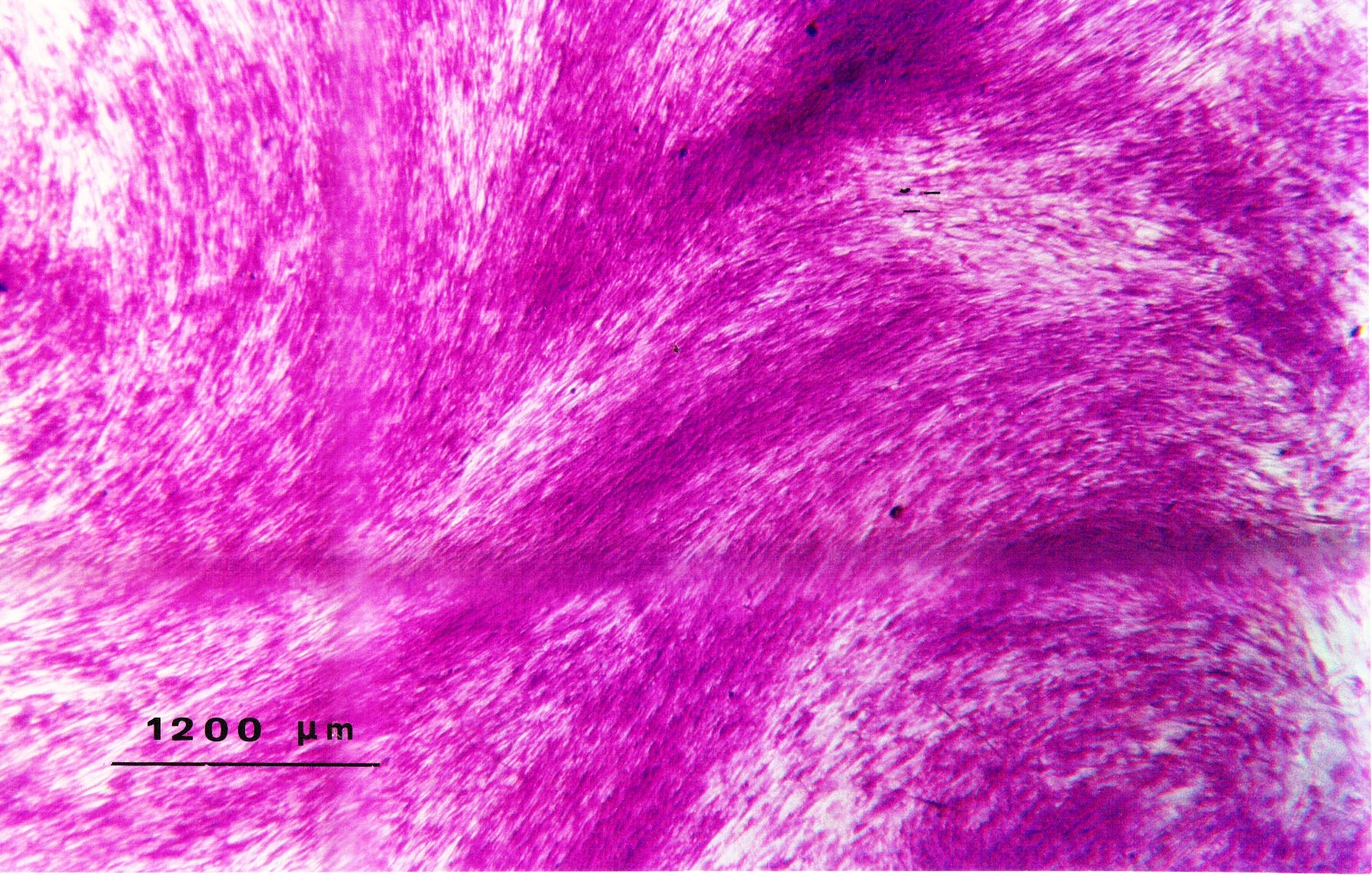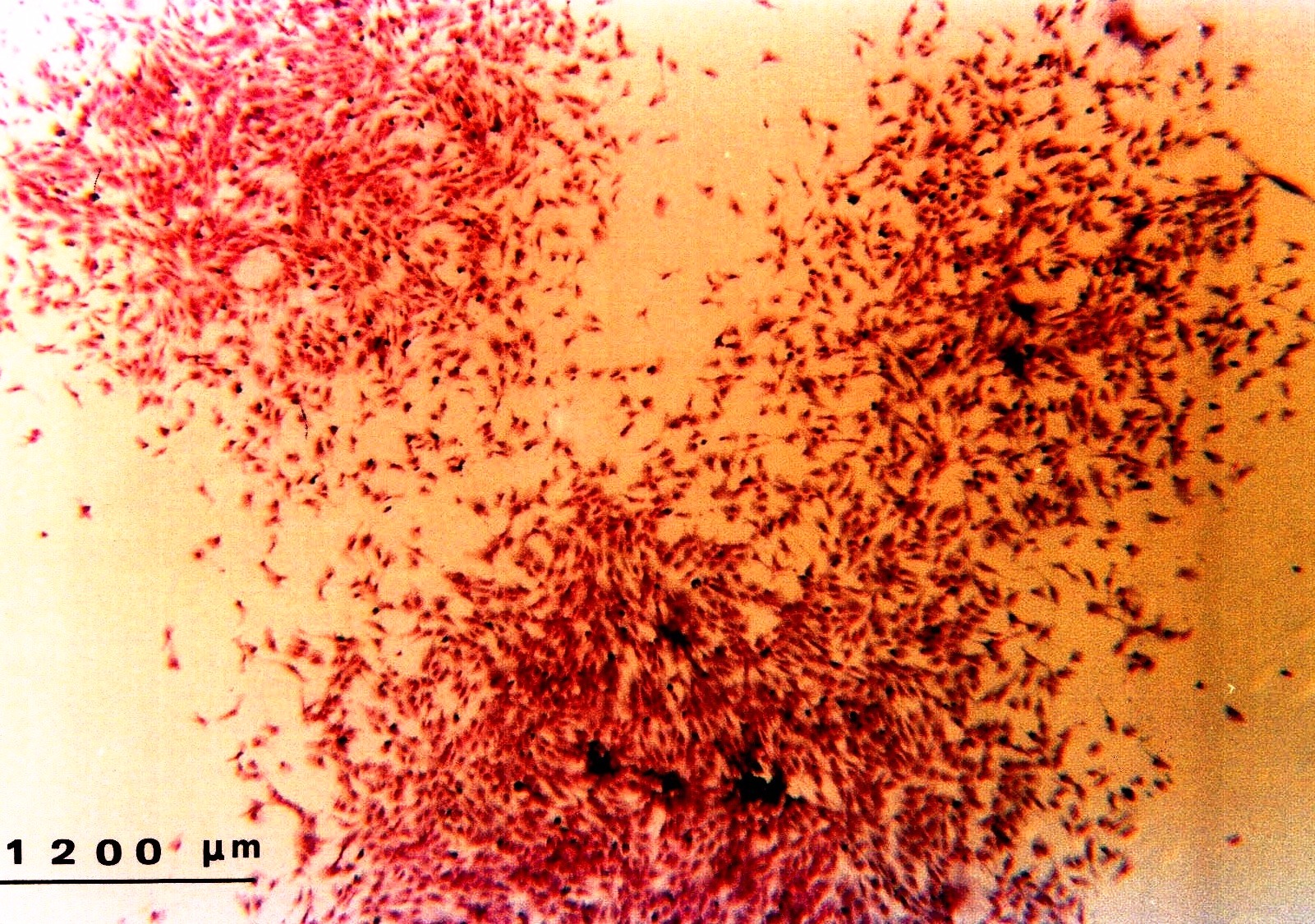 Εικ. 1α-3: Εικόνα με 3 αποικίες CFU-F. Περιέχουν >50 ατρακτόμορφους ινοβλάστες. Προέρχεται από καλλιέργεια δείγματος ανθρωπίνου φυσιολογικού μυελού, 11 ημερών. Οι αποικίες είναι προσκολλημένες στην βάση του δοχείου επώασης και ο περαιτέρω πολλαπλασιασμός τους δημιουργεί το συρρέον στρώμα. - Χρώση: Κρυσταλλικό ιώδες - Μεγέθυνση: x25 εικόνα