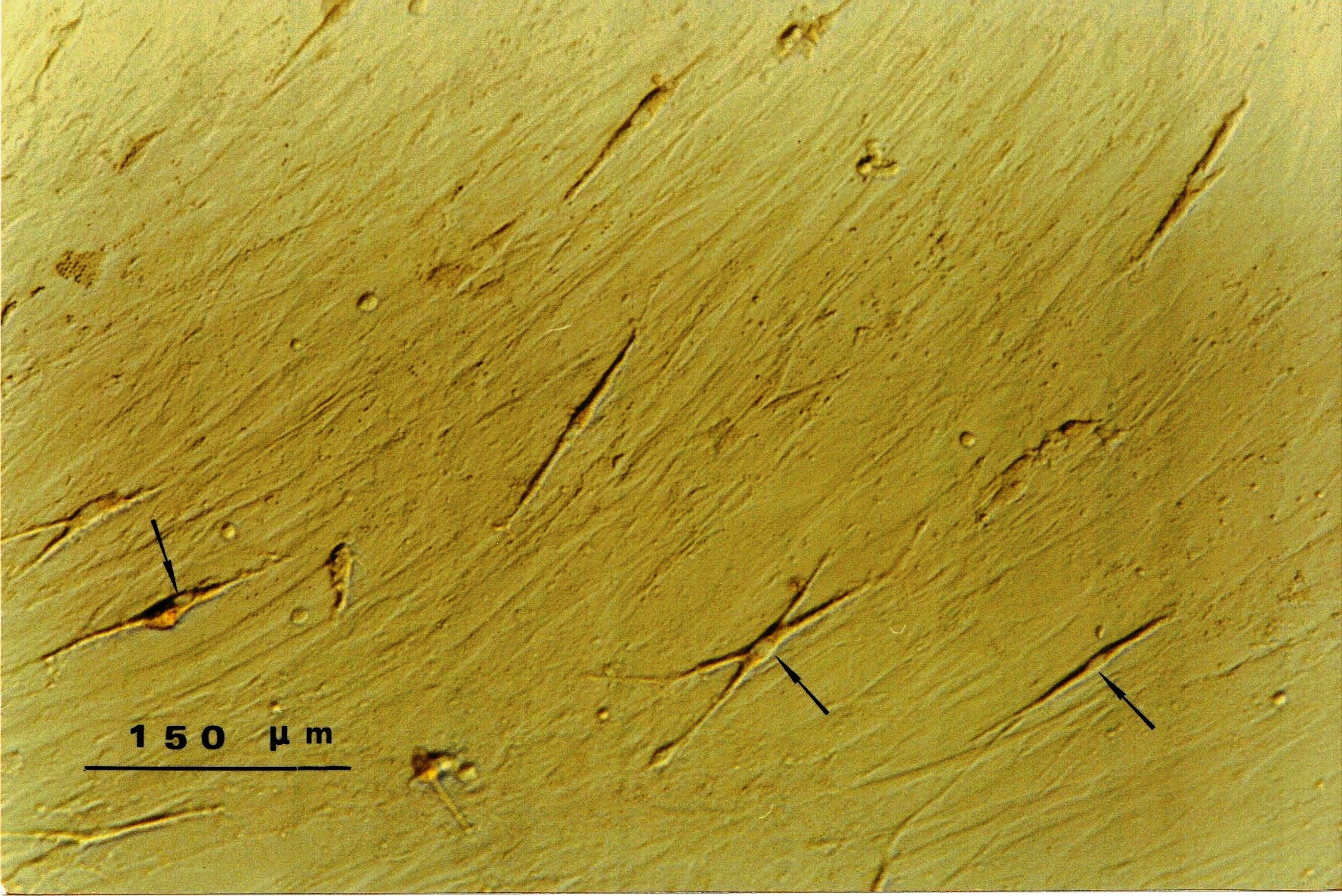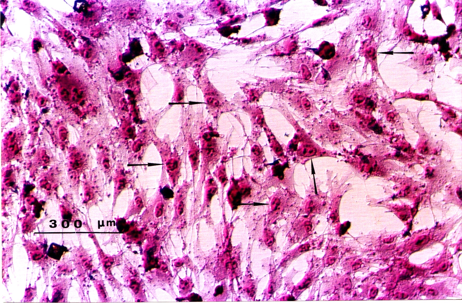 Εικ. 1β-1: Ινοβλαστικό δίκτυο από καλλιέργεια ανθρώπινου φυσιλογικού μυελού 18 ημερών. Διακρίνονται οι έντονα βαμμένοι πυρήνες των ινοβλαστών (βέλη) και ο τρόπος διαπλοκής των κυτταροπλασματικών αποφυάδων τους, κατά την δημιουργία συρρέοντος στρώματος. - Χρώση: Κρυσταλλικό ιώδες - Μεγέθυνση: x100 εικόνα
