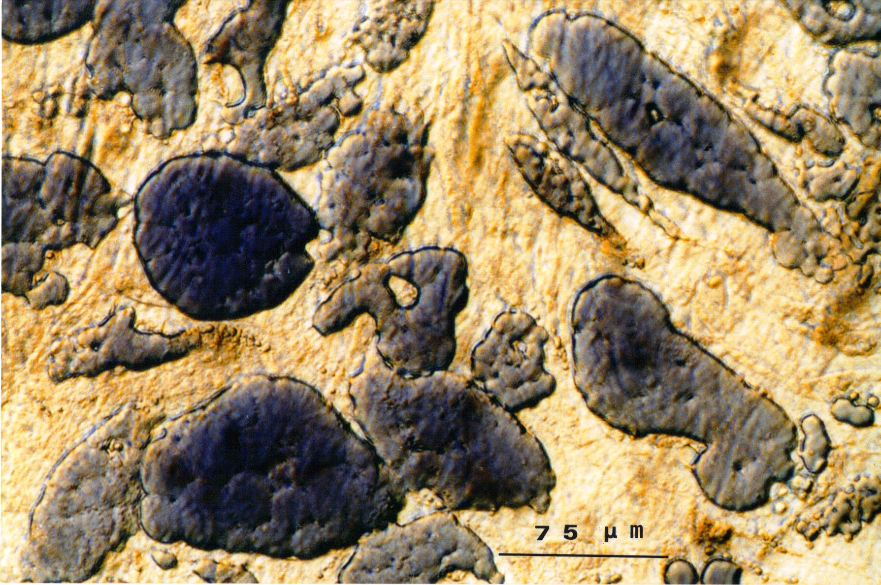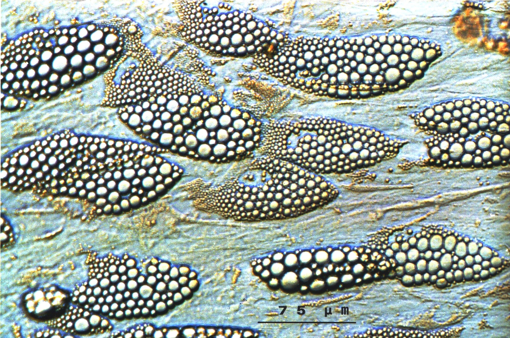 Εικ. 1γ-4: Αποικία γηρασμένων λιποκυττάρων από καλλιέργεια ανθρωπίνου φυσιολογικού μυελού, 13 εβδομάδων. Διακρίνεται η συσσωμάτωση των λιποσταγονιδίων τους. - Χρώση: Sudan Black - Μεγέθυνση: x400 εικόνα