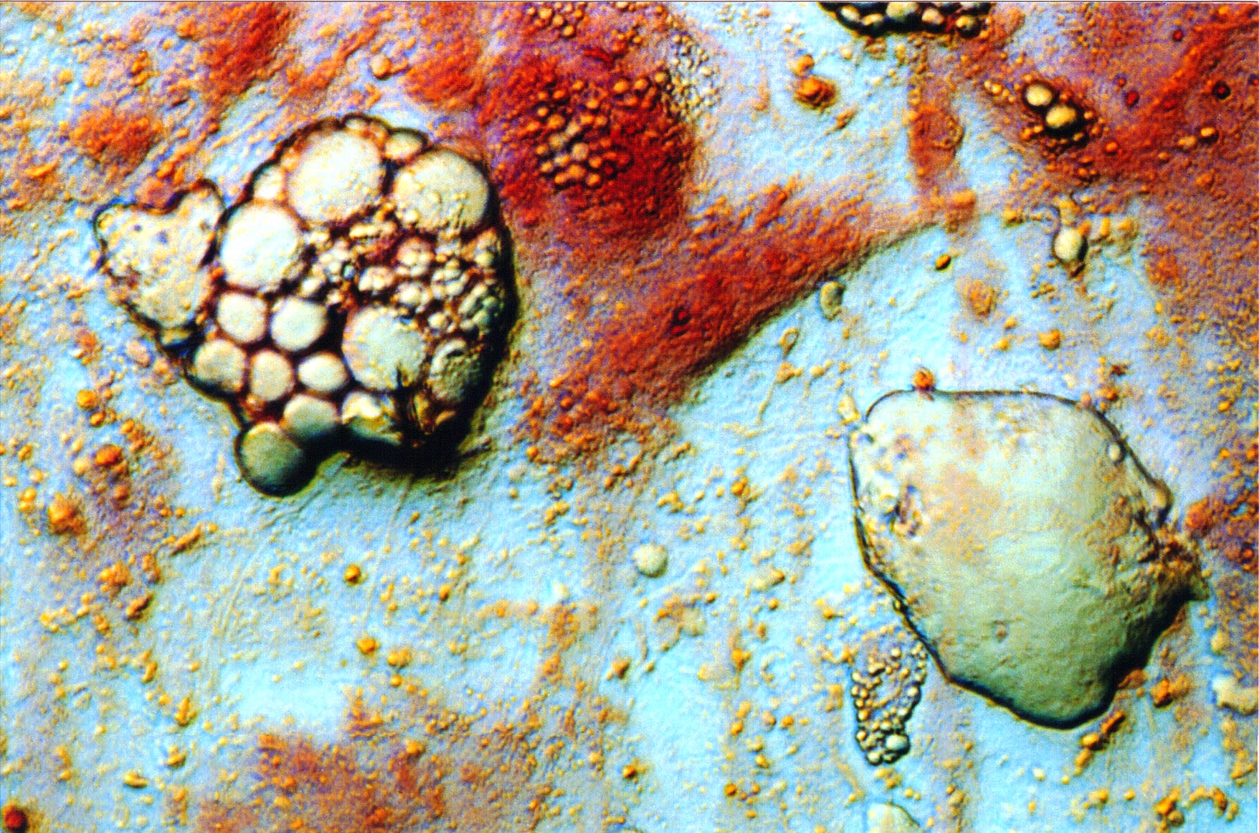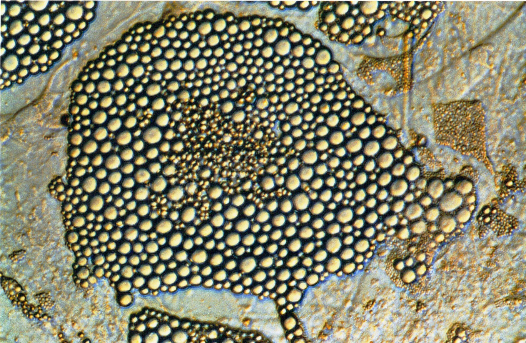 Εικ. 1γ-3: Δύο μεγάλα γηραλέα λιποκύτταρα από καλλιέργεια φυσιολογικού μυελού 60 ημερών. Αριστερά έχει αρχίσει η συσσωμάτωση των λιποσταγονιδίων, που επέρχεται προϊούσης της ηλικίας των κυττάρων και η οποία συνοδεύεται από μείωση της φωτοδιαθλαστικότητάς τους. Δεξιά έχει περατωθεί η συσσωμάτωση με την δημιουργία ενός τεραστίου λιποσταγονιδίου (σπάνιο εύρημα). Τα κύτταρα αυτού του είδους είναι εύθραστα. - Χρώση: Σαφρανίνη - Μεγέθυνση: x400 εικόνα