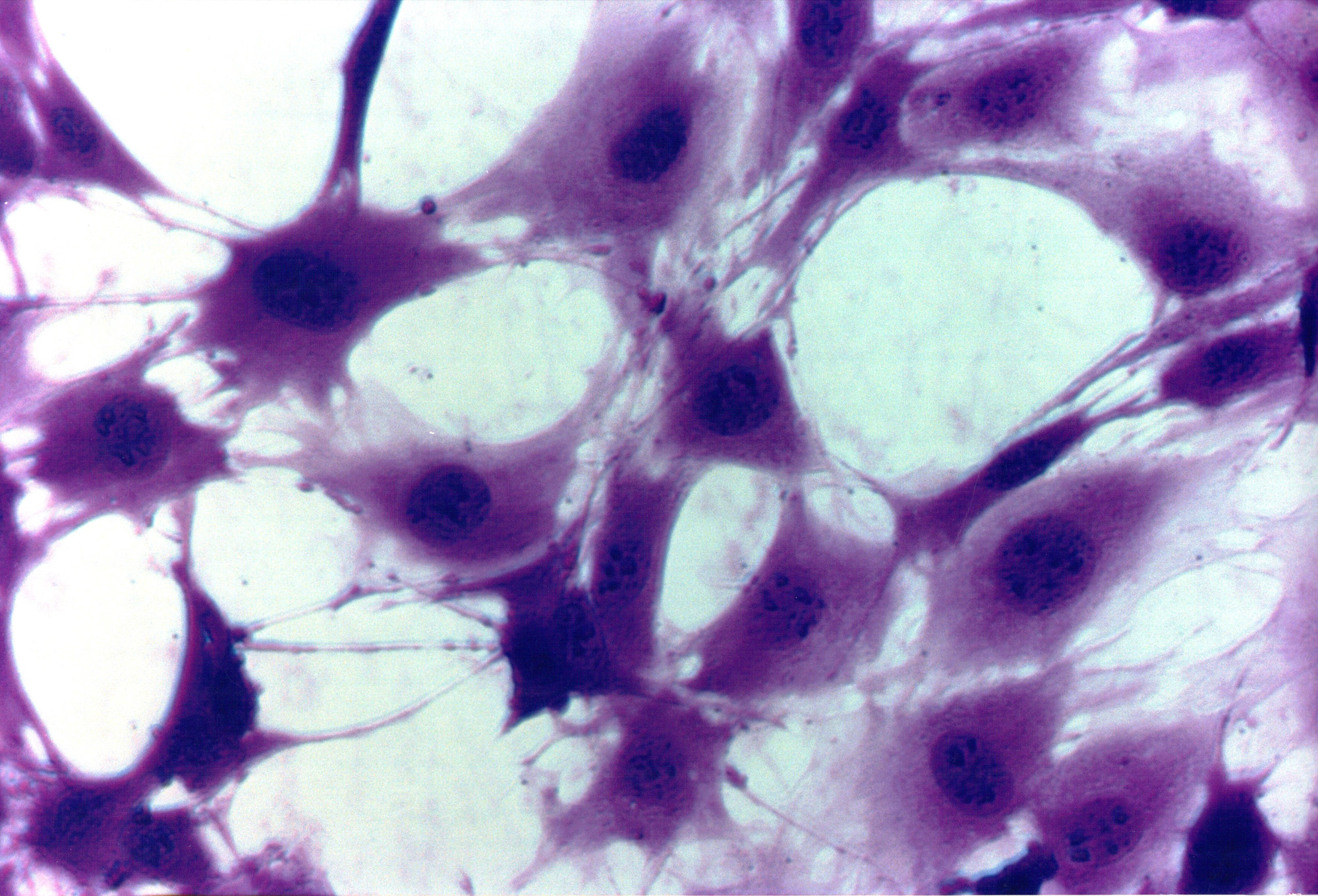 Εικ. 2α-1: Καλλιέργεια κυττάρων 3 ημερών της κλωνικής σειράς Μ210Β4, από υβρίδιο ποντικού F1 γενιάς. Πρόκειται για κύτταρα ινοβλαστοειδούς μορφολογίας (ενδιάμεση μορφή ατρακτόμορφου ινοβλάστη και πεπλατυσμένου ενδοθηλιακού κυττάρου), με πυρήνα ευμεγέθη (βέλη), που περιέχει ικανό αριθμό πυρηνίσκων. Διαφαίνονται ο χαρακτηριστικός τρόπος διαπλοκής τους και οι κυτταροπλασματικές τους αποφυάδες, η δε ένταση της βαφής βαίνει αυξανόμενη από την περιφέρεια του κυττάρου προς το κέντρο. - Χρώση: Κρυσταλλικό ιώδες - Μεγέθυνση: x400 εικόνα