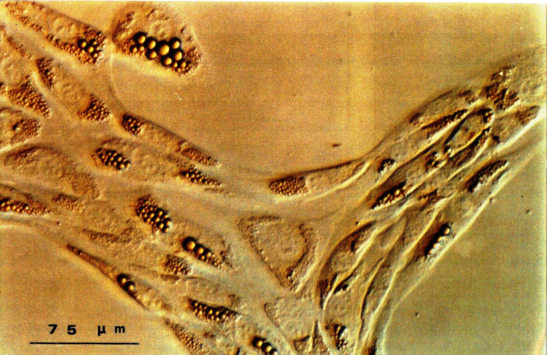 Εικ. 1γ-1: Μακροπρόθεσμη καλλιέργεια 23 ημερών από φυσιολογικό μυελό των οστών. Απεικονίζεται αποικία νέων γιγαντόμορφων λιπωδών κυττάρων διατασσομένων Παράλληλα προς τους ινοβλάστες, σε συρρέον στρώμα. Σε ορισμένα διακρίνεται ο πυρήνας εκτοπισμένος στο άκρον του κυτταροπλάσματος, το οποίο είναι πλήρες λιποσταγονιδίων. Δεξιά δικρίνονται δύο ατρακτόμορφοι ινοβλάστες. - Mεγέθυνση: x400 εικόνα