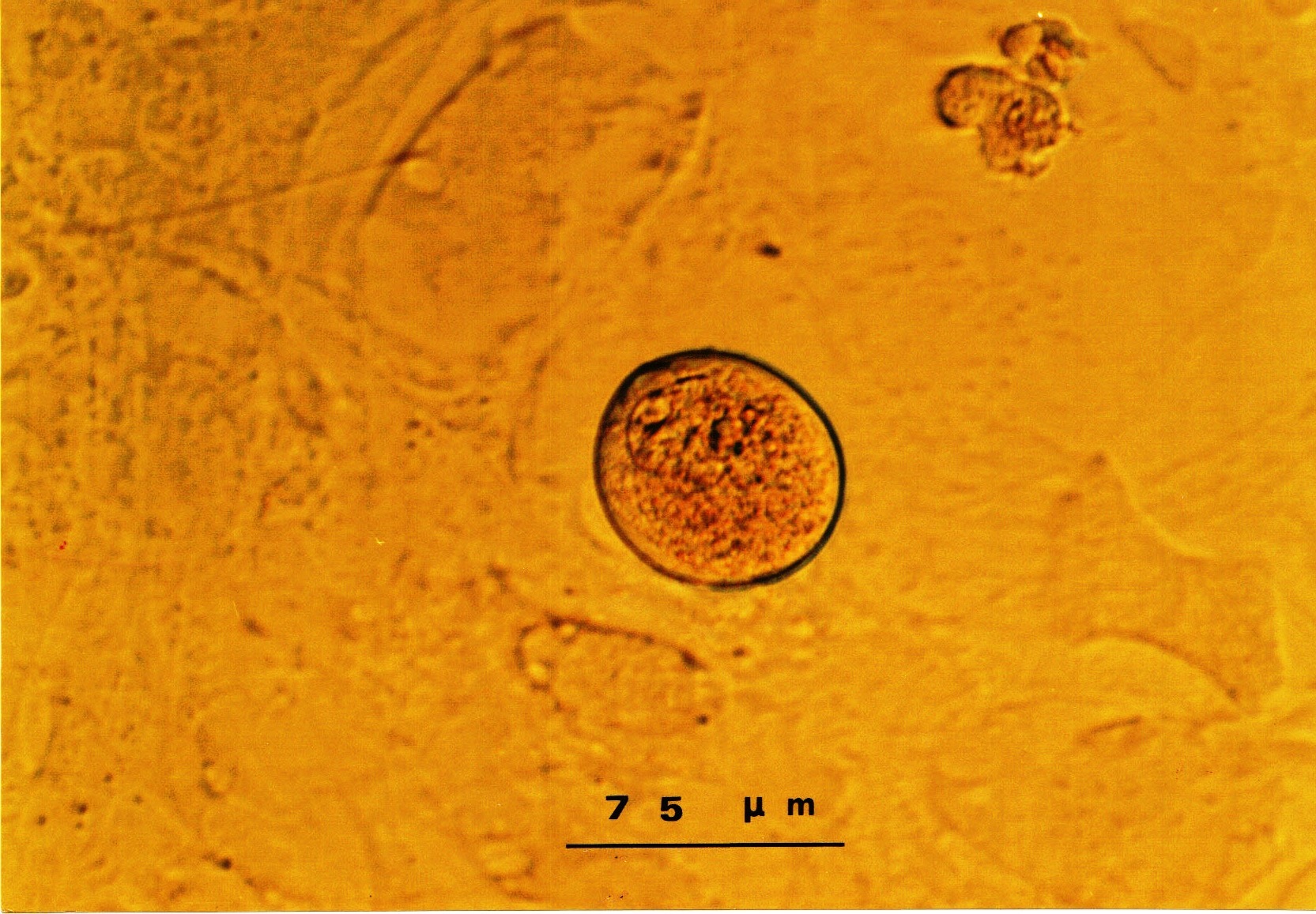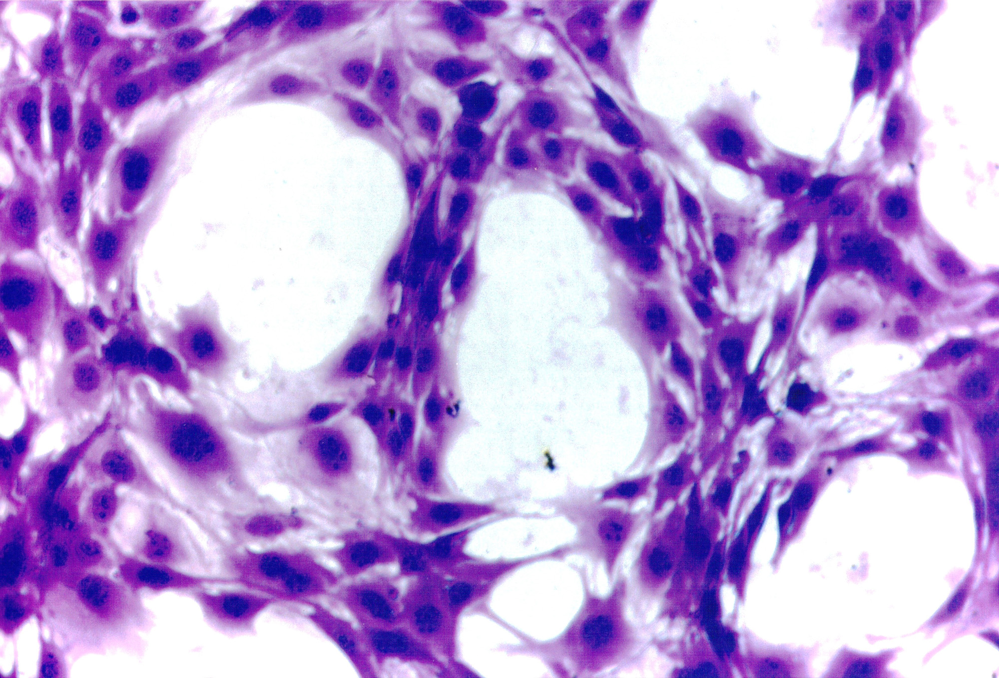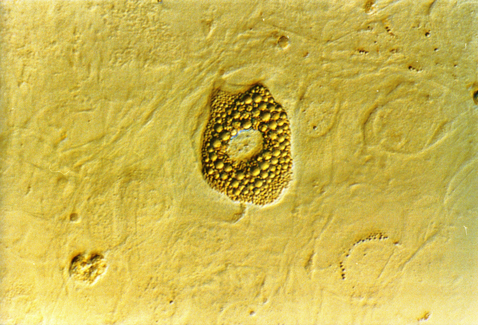 Εικ. 2α-3: Χαρακτηριστικό ευμέγεθες επιπεδόμορφο Μ210Β4 λιποκύτταρο από καλλιέργεια δύο σταδίων 34 ημερών, προερχόμενο από μετασχηματισμό ινοβλαστικού κυττάρου (στο θρεπτικό υλικό περιέχεται υδροκορτιζόνη). Διακρίνεται πλήθος λιποσταγονιδίων που καλύπτουν όλο το κυτταρόπλασμα περιφερικά του πυρήνα του, σχηματίζοντας χαρακτηριστική μορφή δίκην δακτυλίου. - Μεγέθυνση: x400 εικόνα