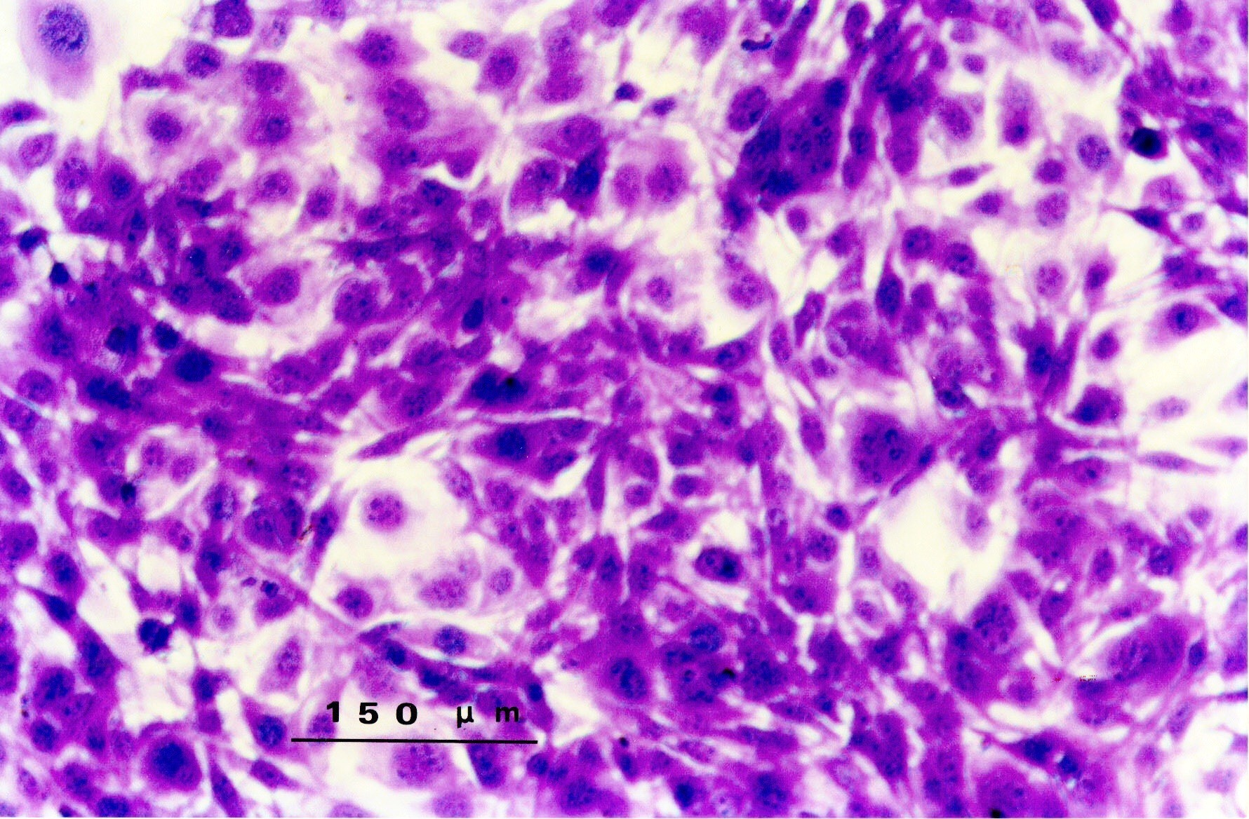 Εικ. 4α-1: Kaλλιέργεια 3 ημερών της κυτταρικής σειράς 5637 (ανθρώπινα επιθηλιακά καρκινικά κύτταρα ουροδόχου κύστεως). Το υπερκείμενο των καλλιεργειών τους περιέχει τους παραγόμενους αυξητικούς παράγοντες (C-kit ligand, IL-1, IL-6, GM-, G-CSF) και χρησιμοποιείται ως συστατικό θρεπτικών υλικών σε κλωνογόνες καλλιέργειες προγονικών αιμοποιητικών κυττάρων (ευγενής παραχώρηση της σειράς από το Paterson Institute, Christie Hospital - Manchester, UK). - Χρώση: Σαφρανίνη - Μεγέθυνση: x400 εικόνα