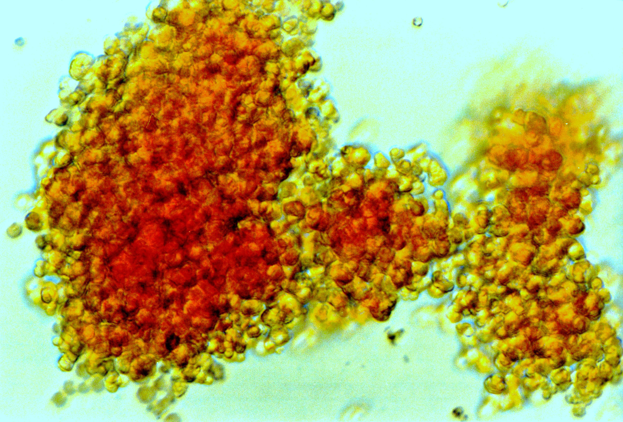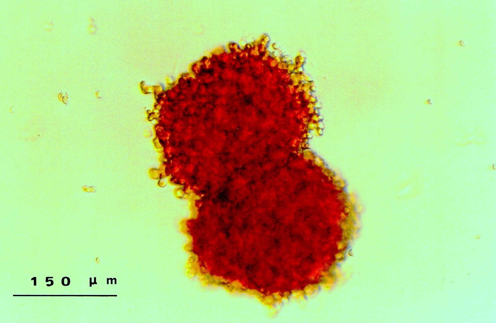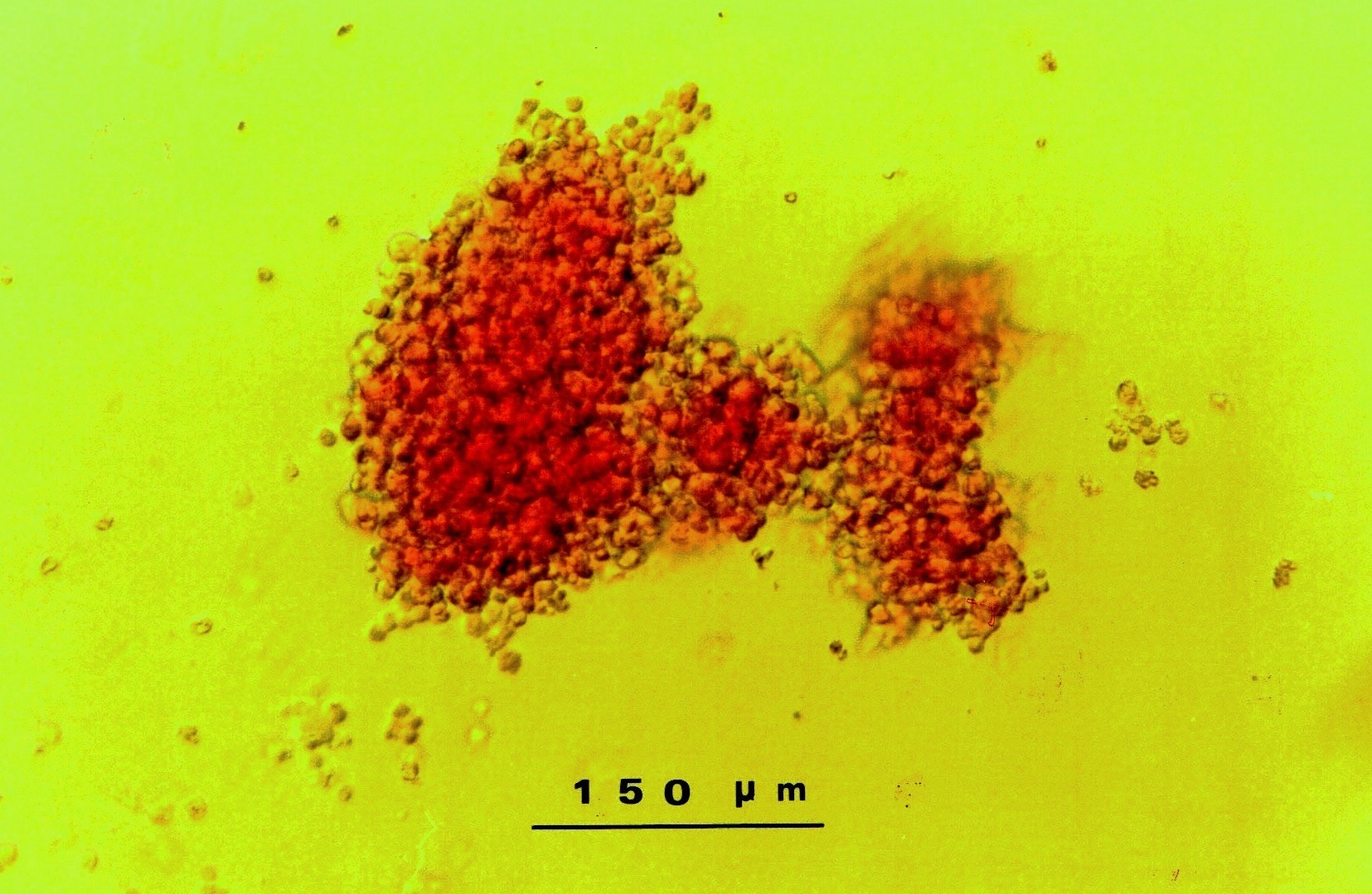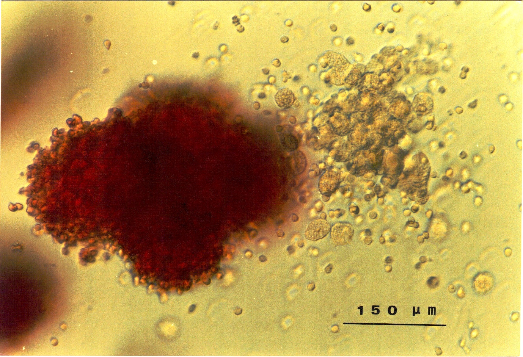 Εικ. 2δ-1: Aποικία CFU-E αποτελούμενη από δύο συσσωματώματα ερυθροβλαστών με καλώς ορατή την συντεθείσα αιμοσφαιρίνη, χρώματος ερυθροπορτοκαλοχρόου. Το CFU-E προγονικό κύτταρο δημιουργεί μικρότερες σε μέγεθος αλλά ταχύτερα ωριμάζουσες ερυθρές αποικίες, αποτελούμενες από ένα (Εικ. 2δ-1.1) ή δύο συσσωματώματα (παρούσα εικόνα) που περιέχουν συνολικά 8-100 ή 8-200 ερυθροβλάστες. - Μεγέθυνση: x200 εικόνα