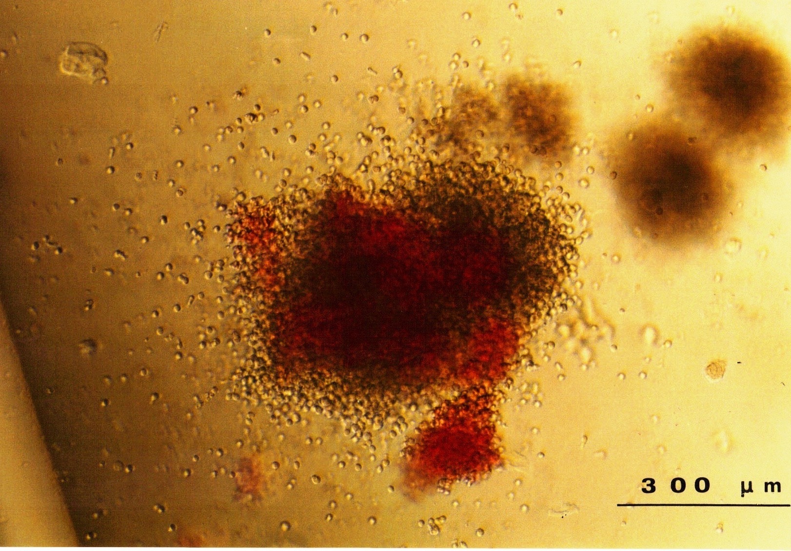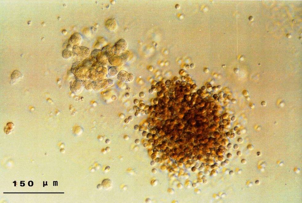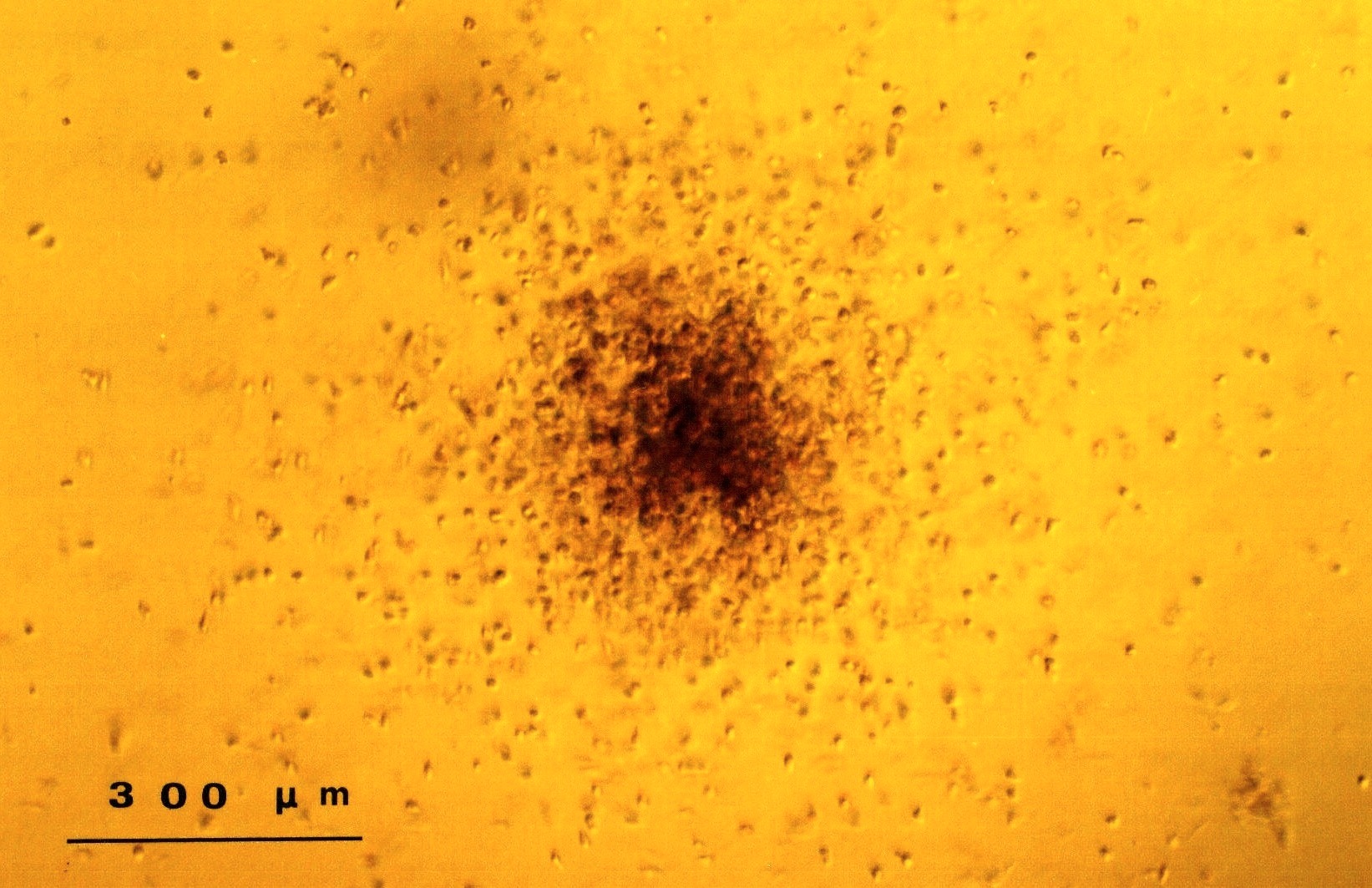 Εικ. 2δ-3: Αρχέγονη BFU-E αποικία. Αποτελείται από 9 μικρά συσσωματώματα σε διαφορετικά επίπεδα. Κατατάσσεται στις ενδιάμεσες BFU-E αποικίες (από 9-16 συσσωματώματα με 500-104 ερυθροβλάστες). Με άνω των 16 συσσωματώματα (και άνω των 10.000 κυττάρων) μία BFU-E αποικία κατατάσσεται στις μεγάλες αρχέγονες. - Μεγέθυνση: x100 εικόνα