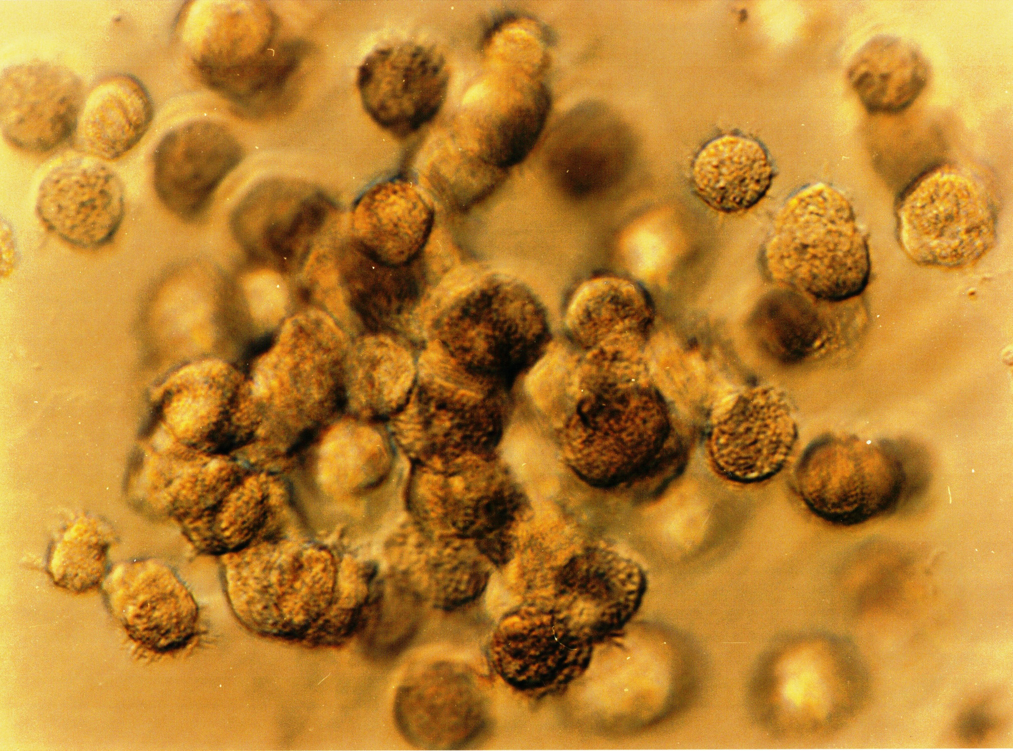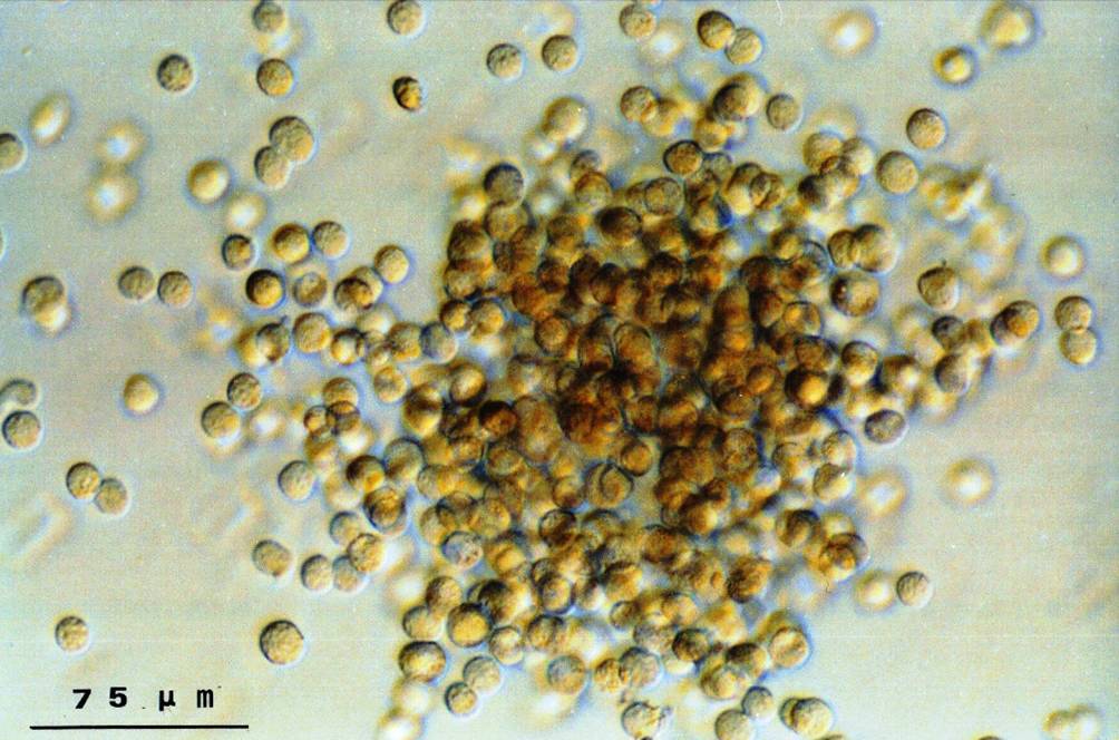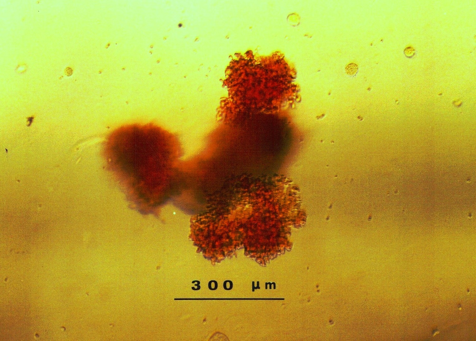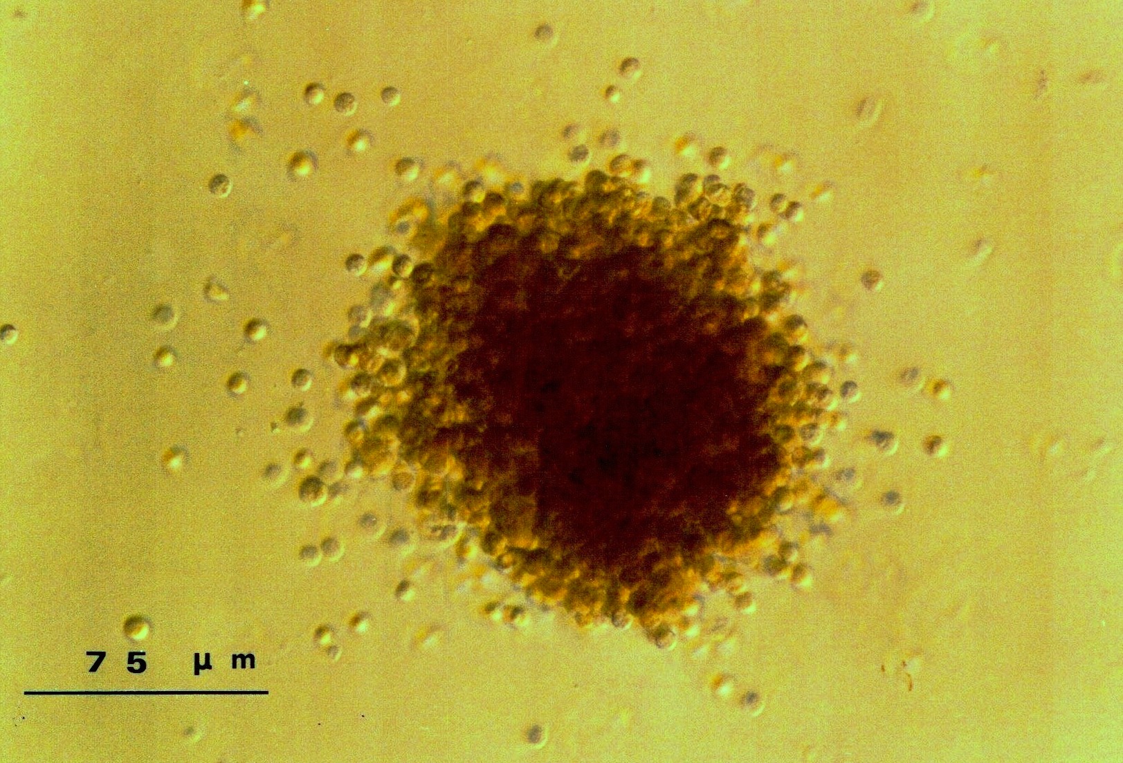 Εικ. 2δ-3: Αρχέγονη BFU-E αποικία. Αποτελείται από 9 μικρά συσσωματώματα σε διαφορετικά επίπεδα. Κατατάσσεται στις ενδιάμεσες BFU-E αποικίες (από 9-16 συσσωματώματα με 500-104 ερυθροβλάστες). Με άνω των 16 συσσωματώματα (και άνω των 10.000 κυττάρων) μία BFU-E αποικία κατατάσσεται στις μεγάλες αρχέγονες. - Μεγέθυνση: x100 εικόνα