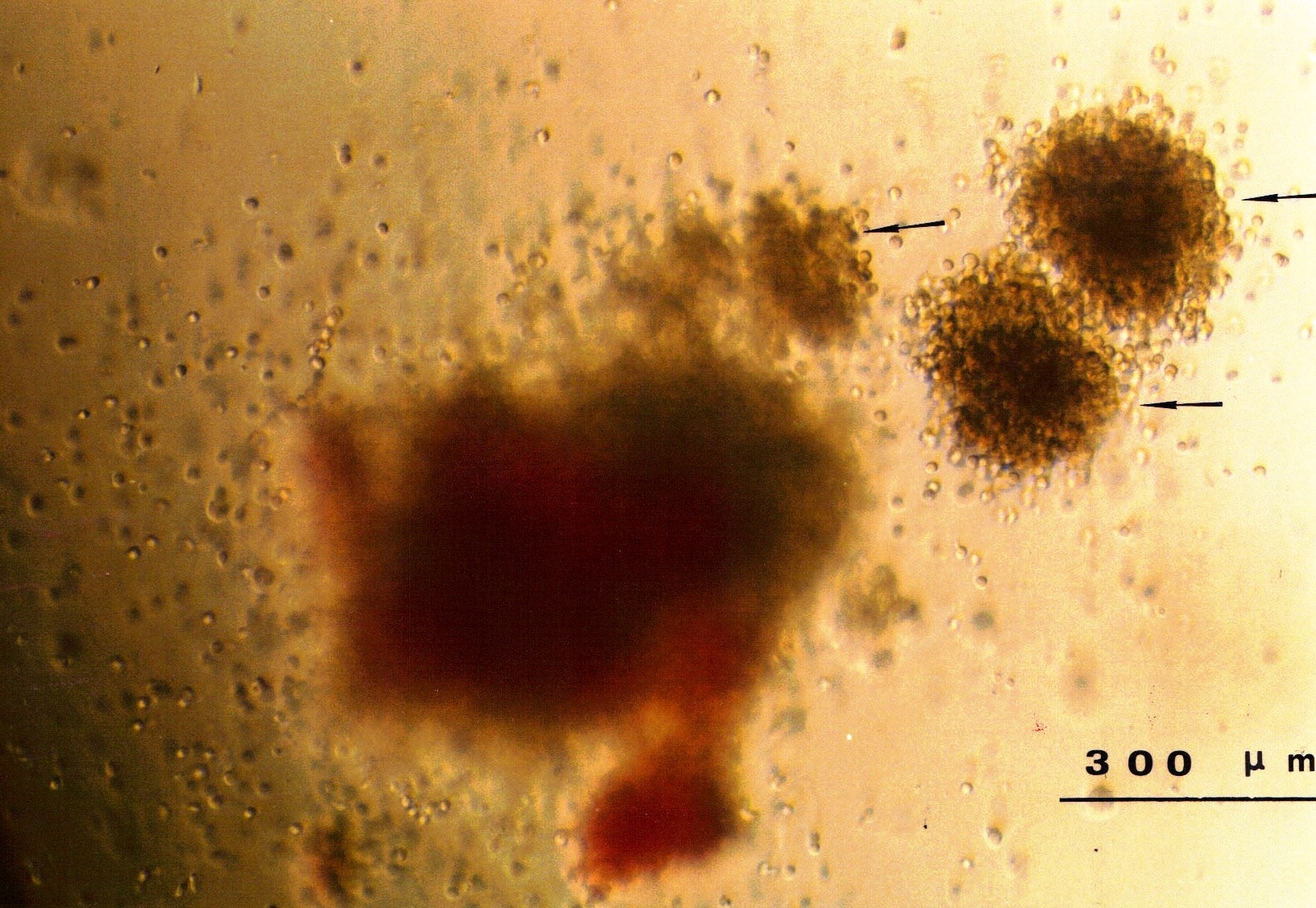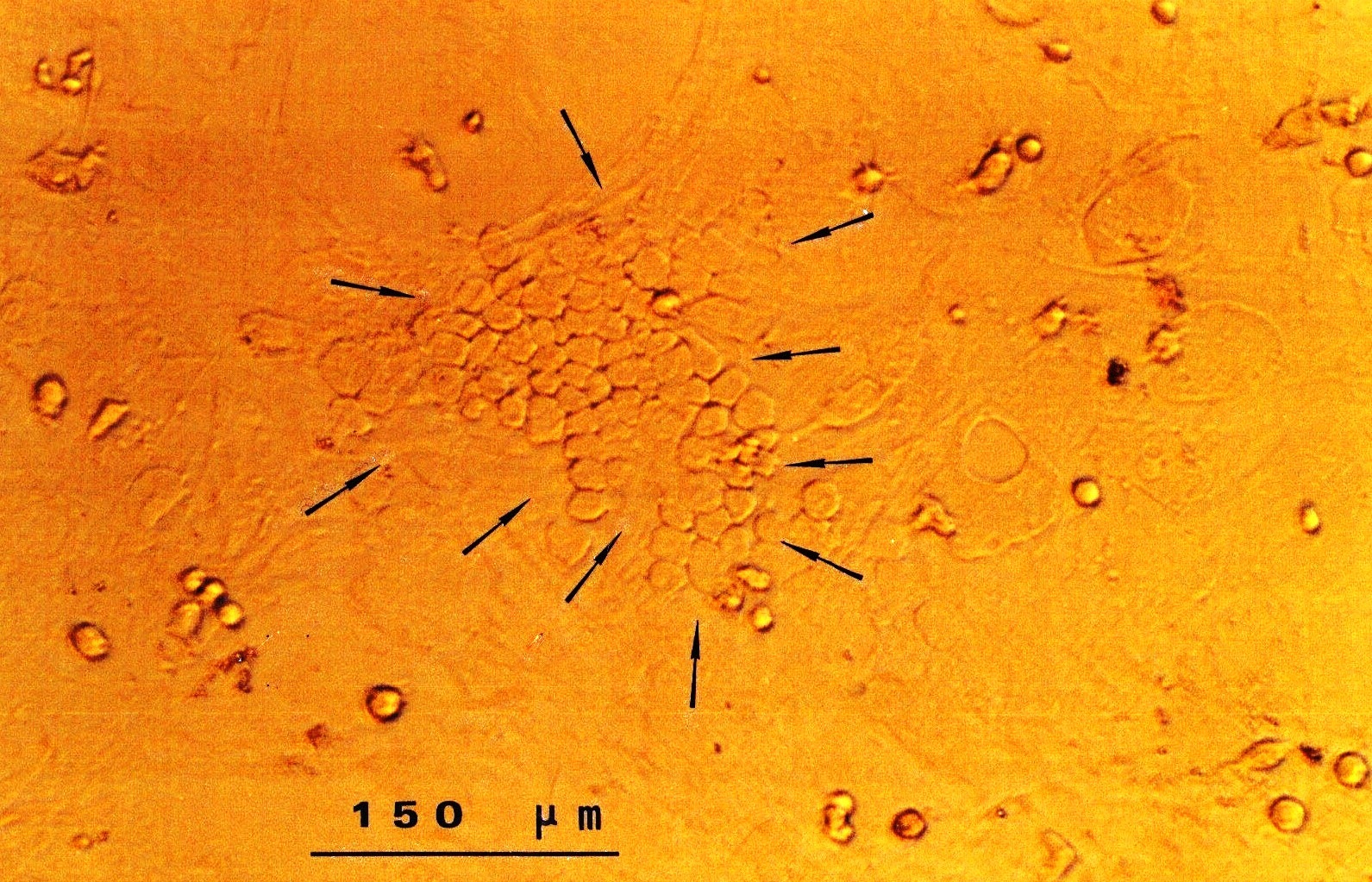 Εικ. 2γ-3: Tυπική C.A. μικρού μεγέθους από καλλιέργεια φυσιολογικού μυελού δύο εβδομάδων (περιβάλλεται από λεπτά βέλη). Διακρίνεται πλήθος φωτοδιαθλαστικών κυττάρων του υπερκειμένου. Τα μεγαλύτερα εξ αυτών (μεγαλύτερα βέλη) κιτρινωπής χροιάς, ανήκουν στην μεγακαρυοκυτταρική σειρά. -- Μεγέθυνση: x20 εικόνα