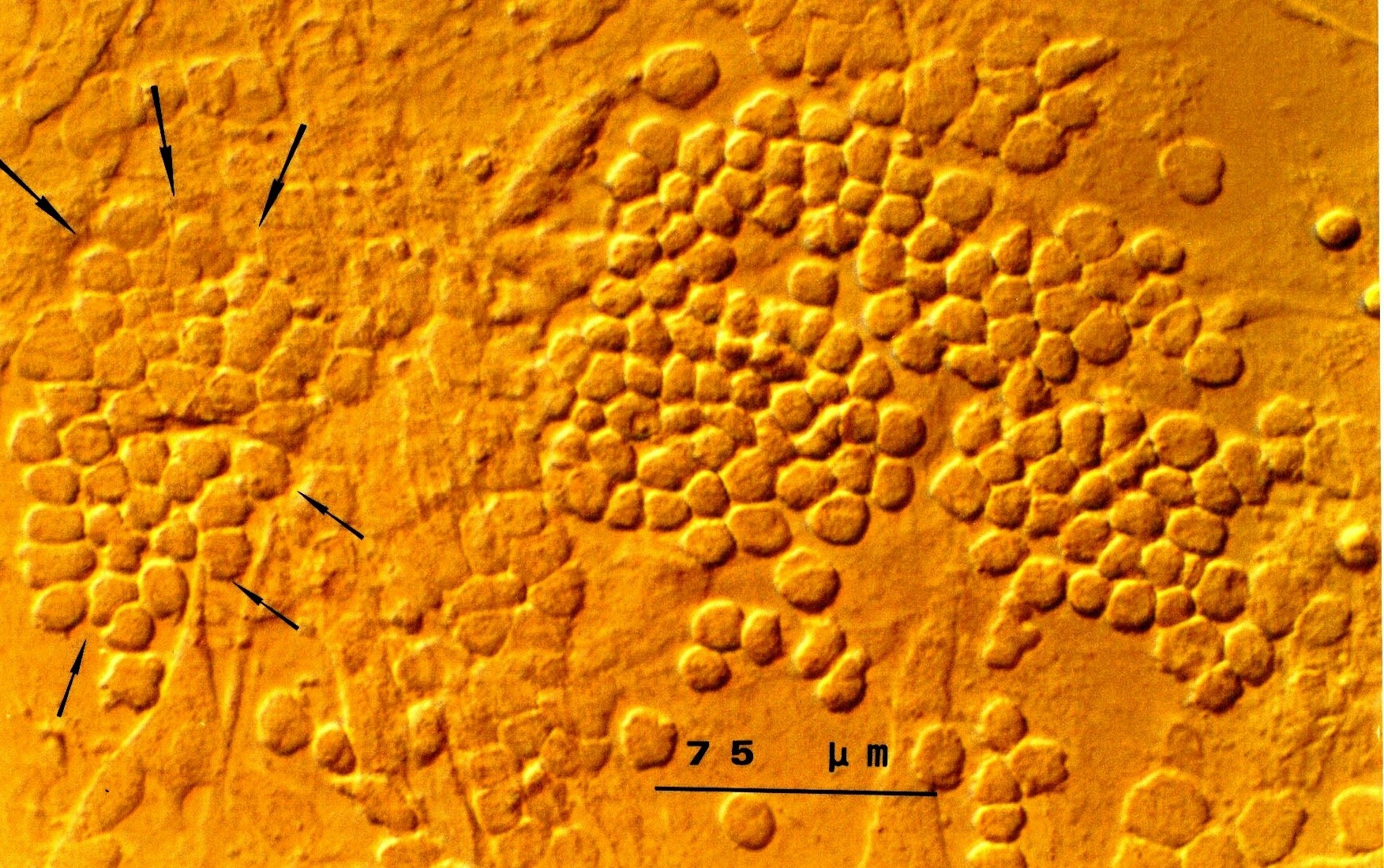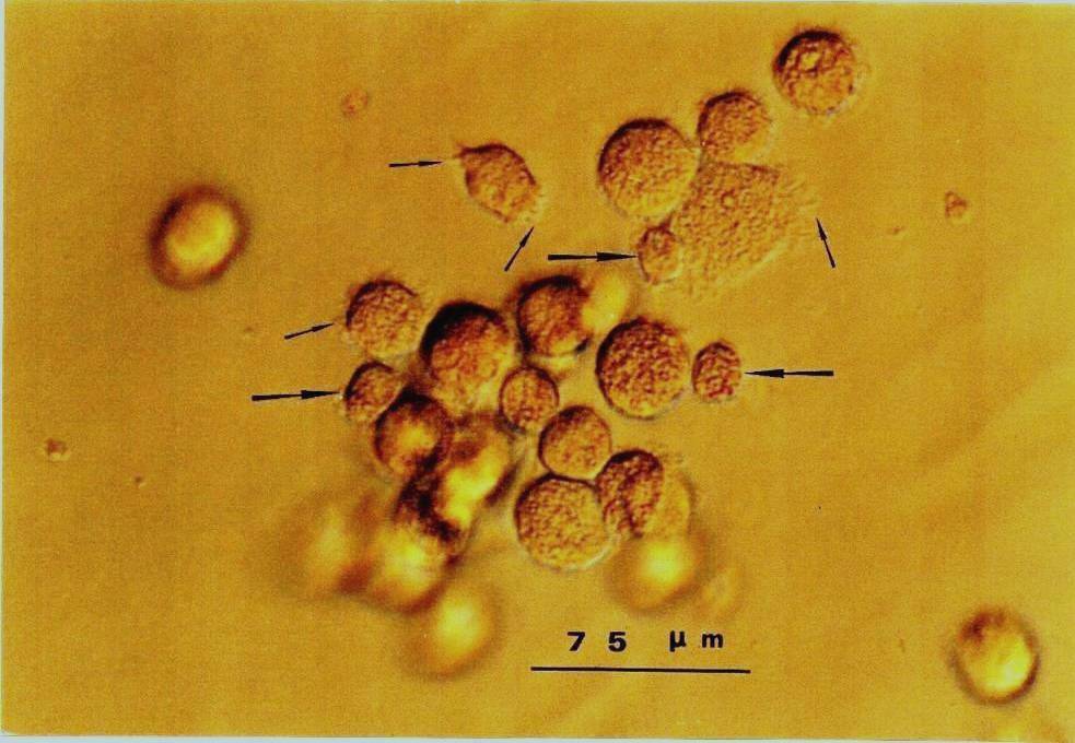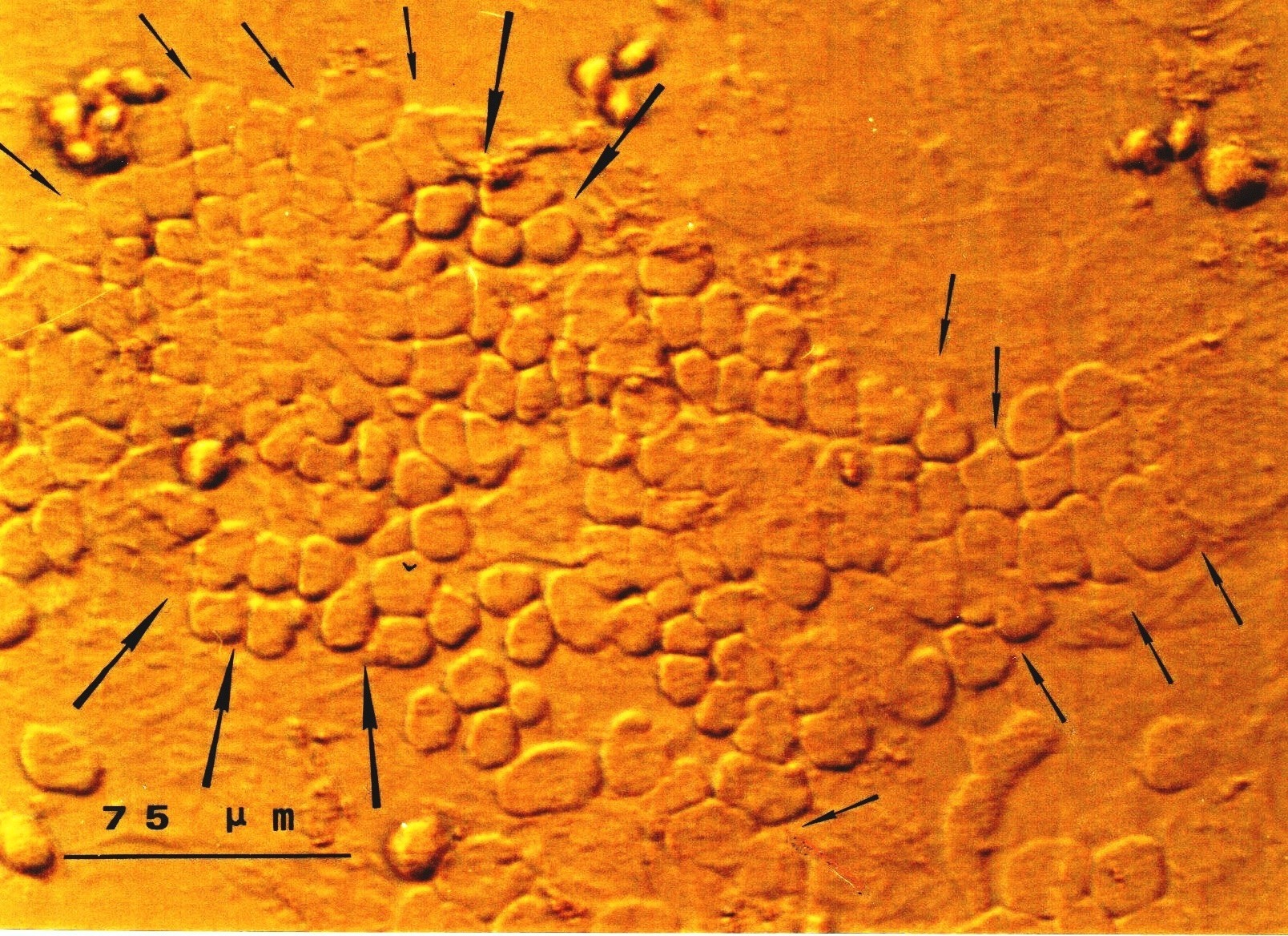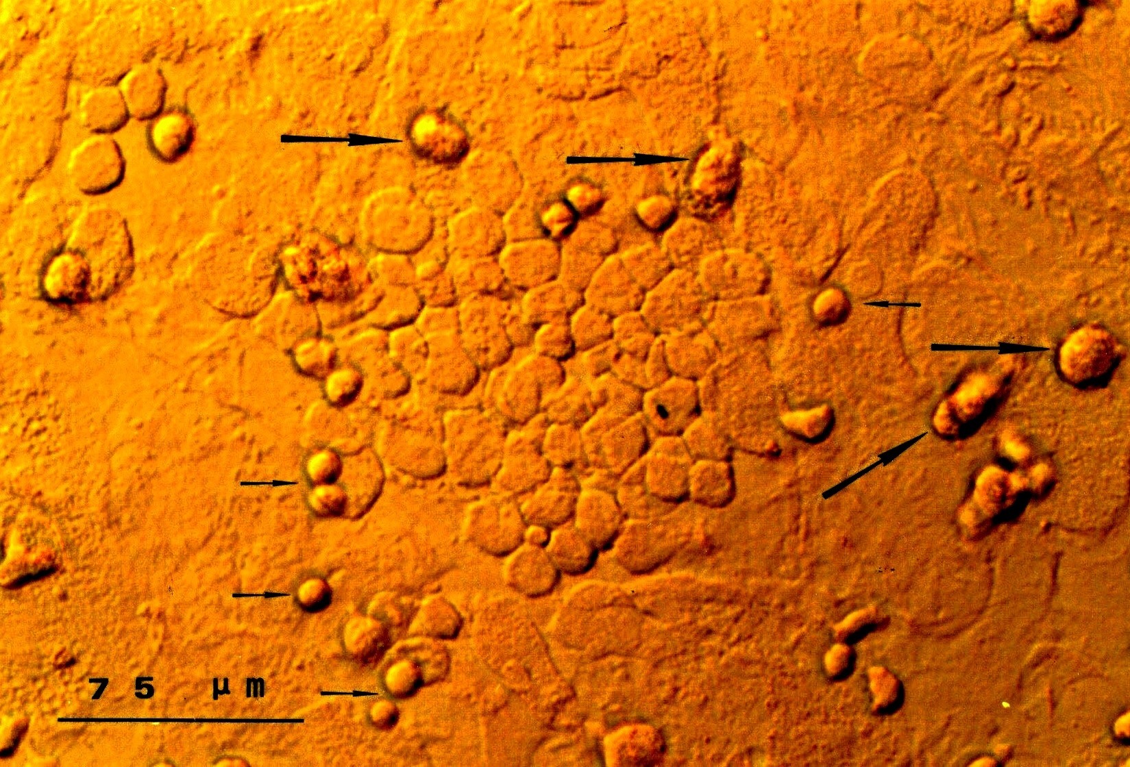 Εικ. 3γ-1: Έλεγχος βιωσιμότητας των Μ210Β4 κυττάρων μετά την απόψυξή τους απ’ το υγρό άζωτο. Καταμέτρηση των άχροων ζωντανών κυττάρων (μικρά βέλη) και των νεκρών κυττάρων (μαύρα, λόγω χρήσης διαλύματος νιγροσίνης-βέλη). - Μεγέθυνση: x100 εικόνα