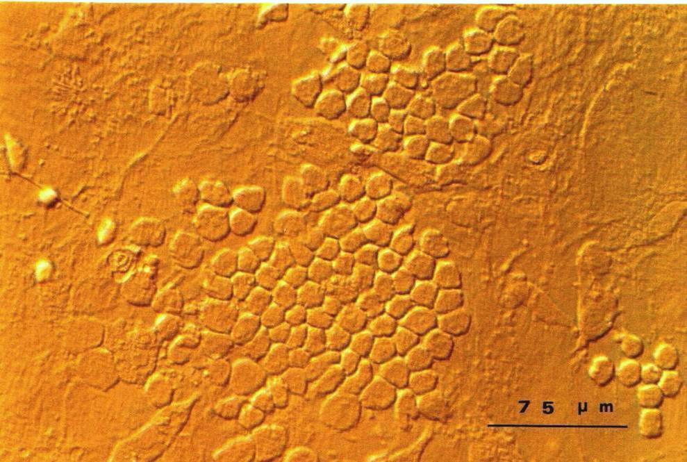 Εικ. 2γ-1: Απεικόνιση δύο τυπικών λιθοστρωτόμορφων περιοχών, από δύο σταδίων καλλιέργεια φυσιολογικού μυελού 35 ημερών. Οι C.A. είναι κλώνοι αιμοποιητικών κυττάρων που εντοπίζονται κατά κανόνα κάτω από τα κύτταρα του στρώματος. Είναι κύτταρα μεγάλα, σκοτεινά, μη φωτοδιαθλαστικά στο μικροσκόπιο αντιθέτου φάσεως, και συχνά πολυγωνικoύ σχήματος. Η τυπική διάταξη των κυττάρων δημιουργεί χαρακτηριστικό σχηματισμό δίκην λιθοστρώτου. - Μεγέθυνση: x400 εικόνα