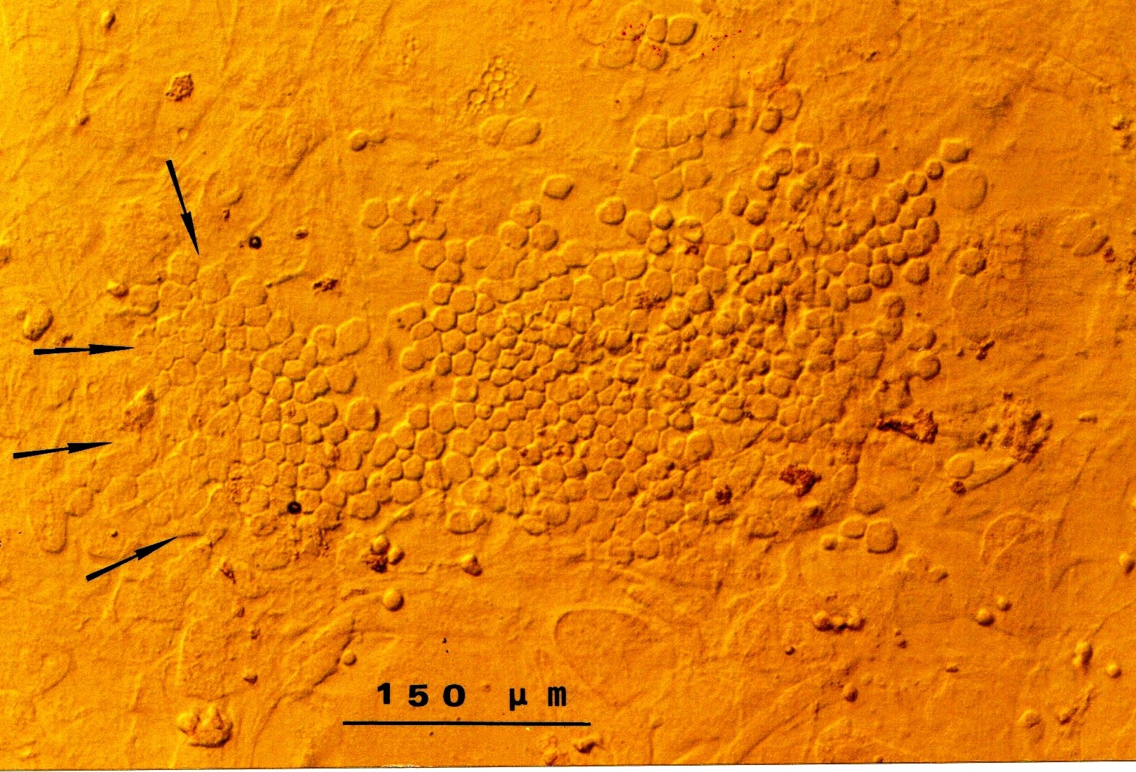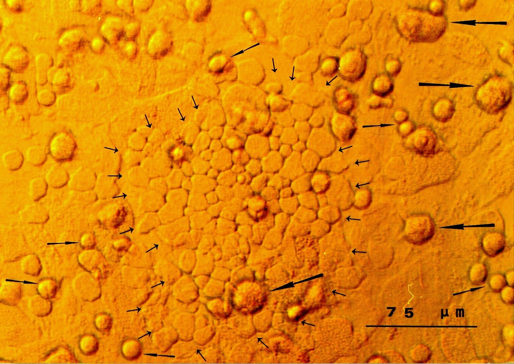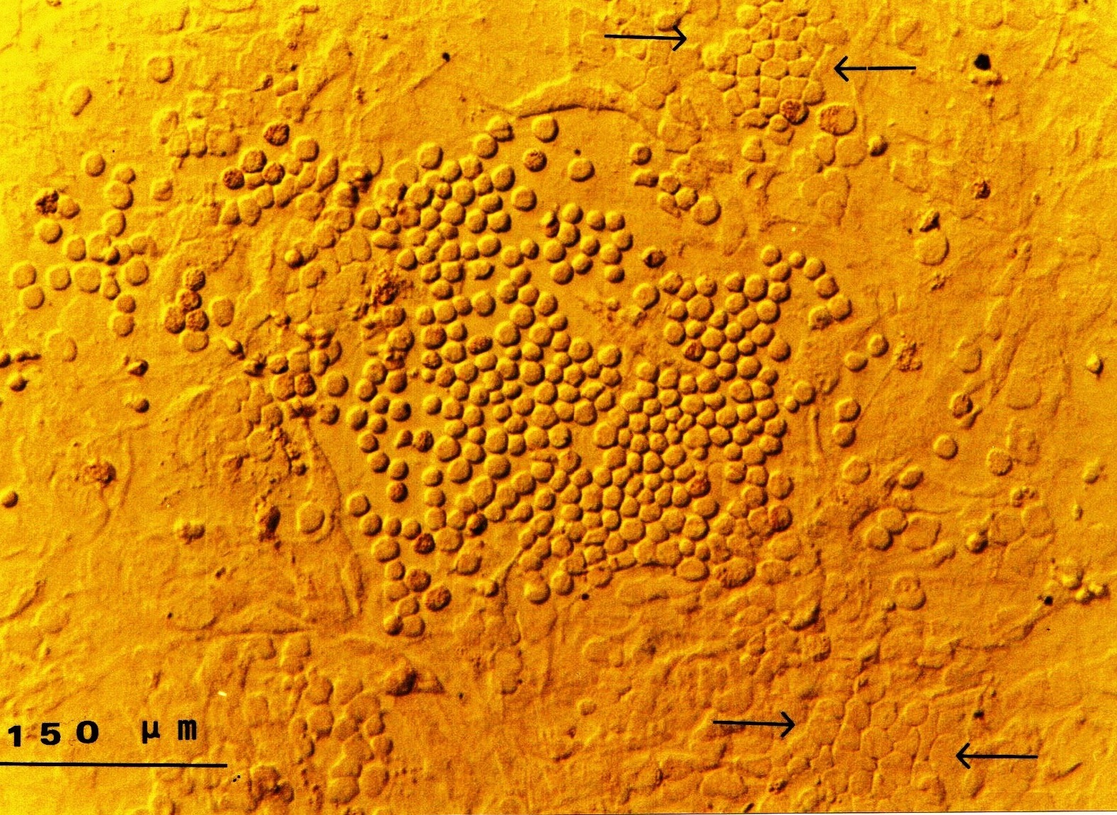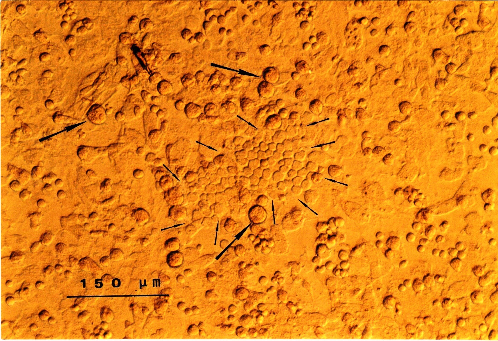 Εικ. 2γ-2: Oι C.A. σχηματίζονται συχνά και μεταξύ των κυττάρων του στρώματος. Στην περίπτωση αυτή εφ’ όσον υπάρχει διαθέσιμος χώρος, η μορφολογική εμφάνιση της δημιουργηθείσας αποικίας παρεκκλίνει του τυπικού λιθοστρώτου αποτελούμενη από κύτταρα μικρότερα, στρογγυλά και λιγώτερο πολυγωνικά. Σύγκριση με τις 2 C.A. των οποίων τα κύτταρα είναι κάτω από το στρώμα (βέλη) και σε φάση αρχόμενης ωρίμανσης (μείωση της πυκνότητας φάσης). Χρόνος καλλιέργειας 4 εβδομάδες. - Μεγέθυνση: x200 εικόνα