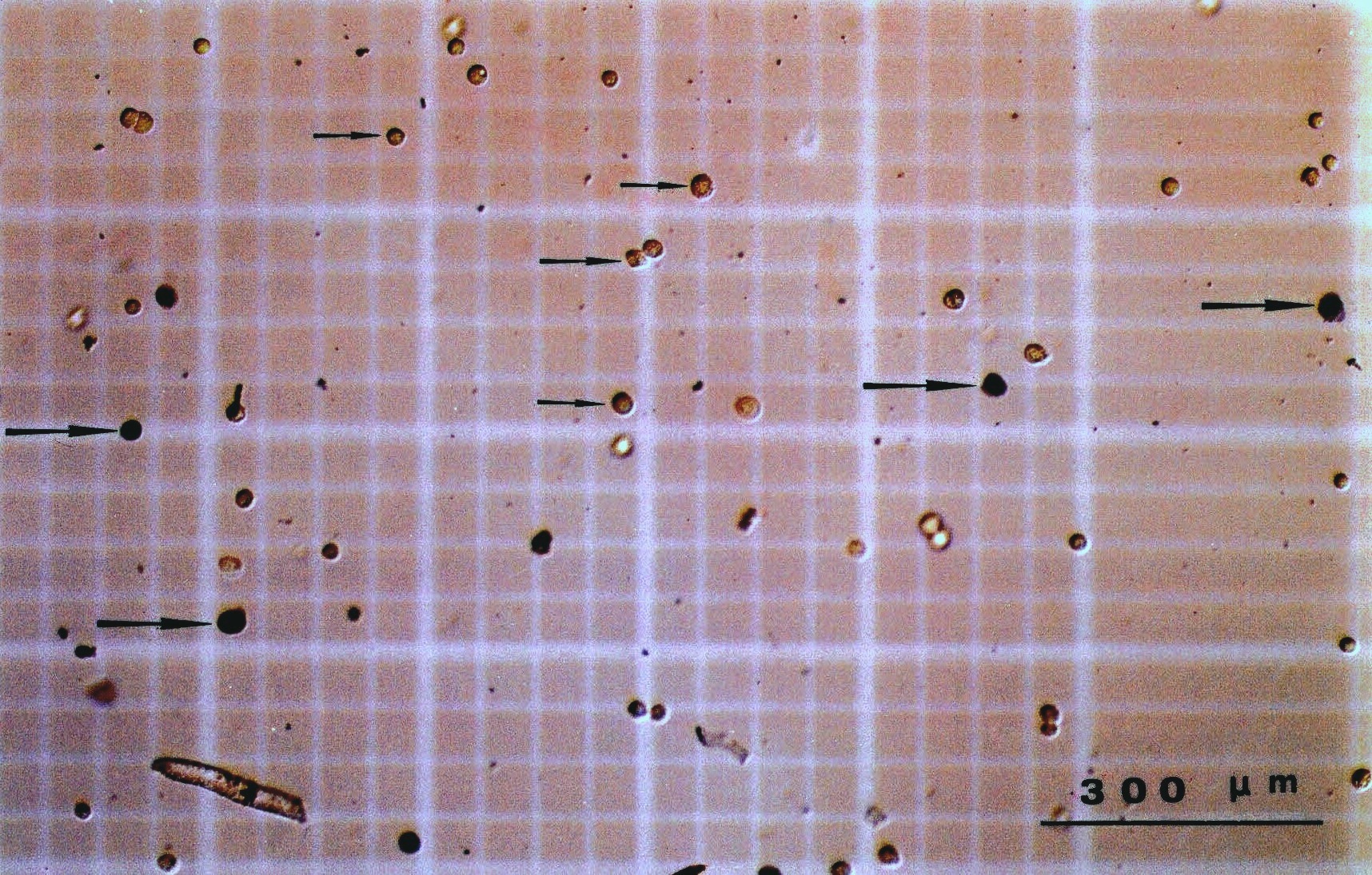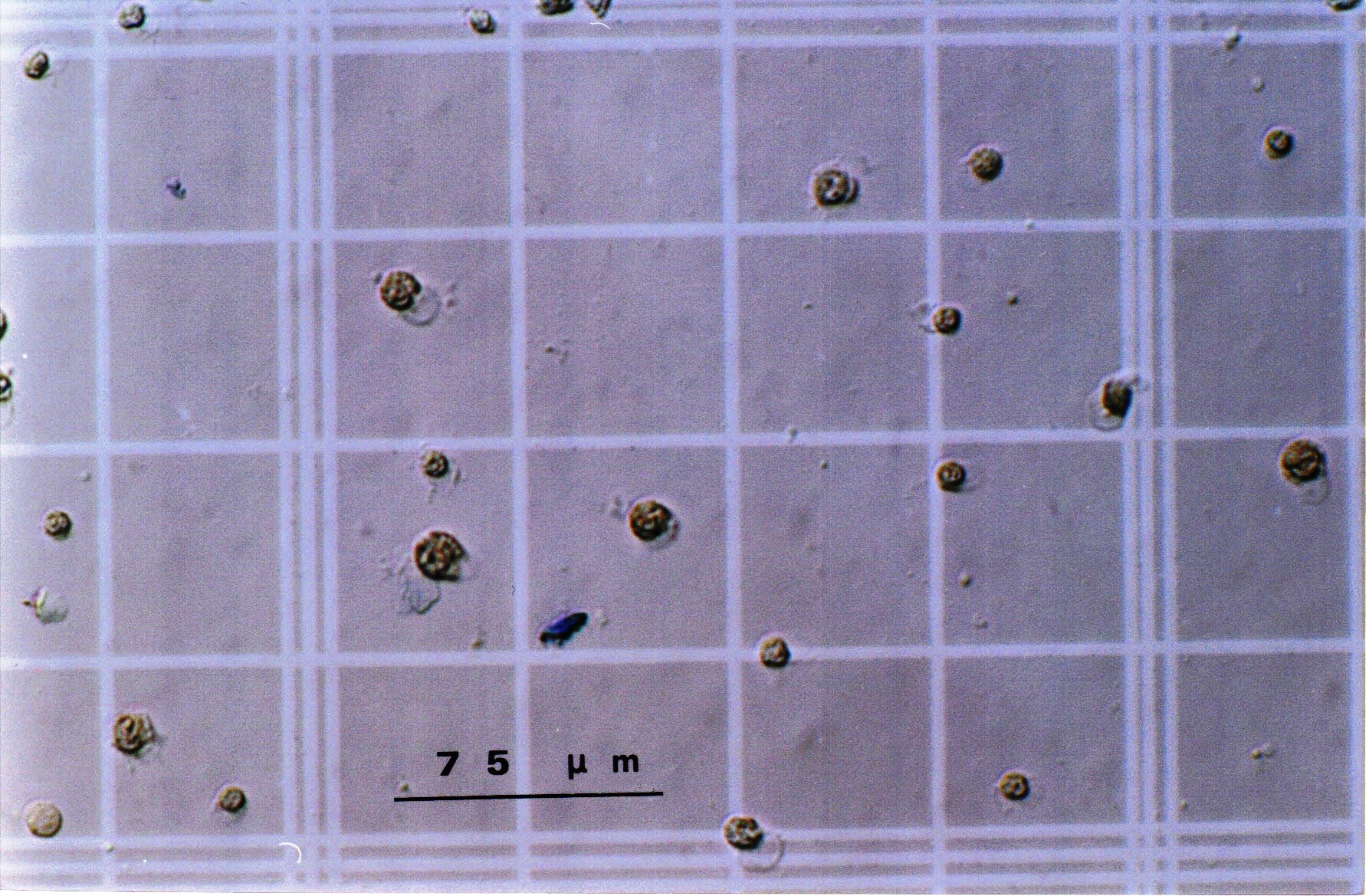 Εικ. 3γ-2: Kαταμέτρηση εμπύρηνων αιμοποιητικών κυττάρων μυελού των οστών στην πλάκα Newbaüer. Οι πυρήνες των κυττάρων είναι ευδιάκριτοι λόγω βαφής τους με την χρωστική μπλε του μεθυλενίου. - Μεγέθυνση: x40 εικόνα